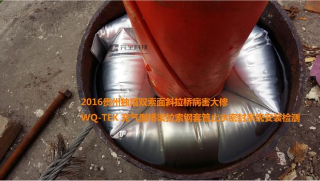 橋梁設(shè)計(jì)、施工、維護(hù)等企業(yè)在貴州紅楓湖特大橋維護(hù)工程項(xiàng)目和佛山奇龍大橋新建項(xiàng)目中采用充氣氣囊(定制型號)對斜拉索導(dǎo)管孔做防水密封,是基于充氣封堵產(chǎn)品和施工技術(shù)在電纜管孔防水封堵領(lǐng)域廣泛應(yīng)用的有效性,是對橋梁斜拉索導(dǎo)管孔防水措施作出的一次大膽嘗試。