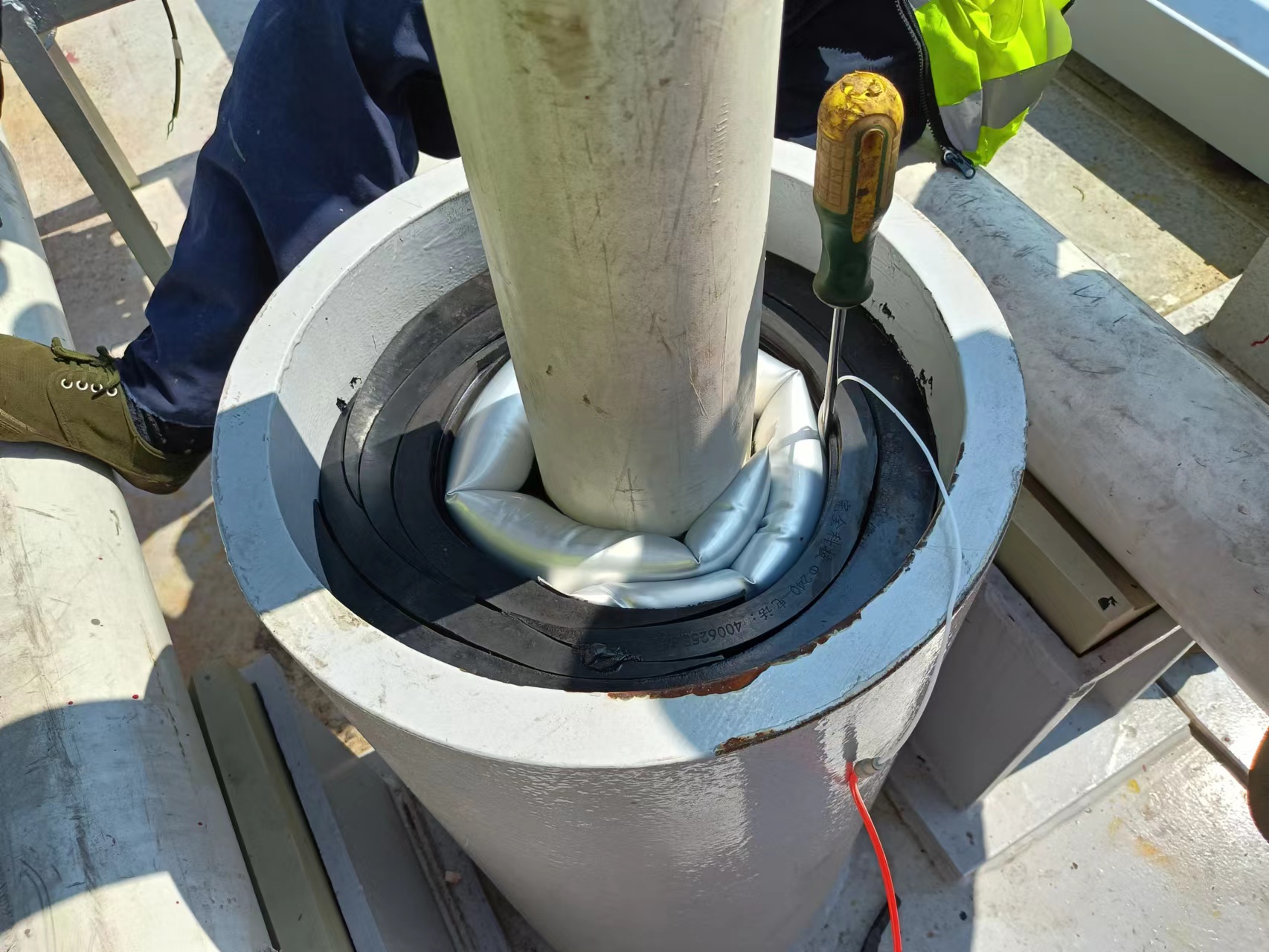 安裝施工方式:密封產品(充氣型斜拉索導管防水密封系統)供應商技術人員做安裝演示和現場指導,項目部施工人員進行施工安裝。