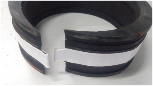 為保證變徑橡膠圈與管道內(nèi)壁(又或是橡膠圈之間)的緊密貼合,需要先對變徑橡膠圈外側(cè)中縫的凹槽貼一條防水膠帶(見下圖)。