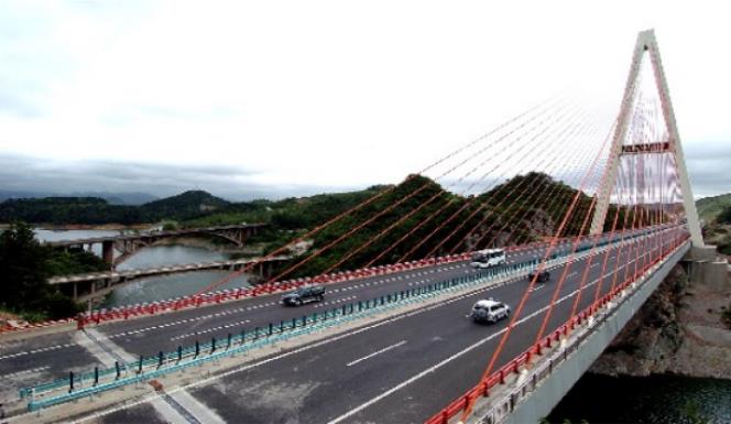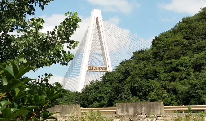 紅楓湖大橋位置處于滬瑞國道主干線清鎮(zhèn)至鎮(zhèn)寧高速公路(貴陽清鎮(zhèn)市)紅楓湖景區(qū)路段,該橋全長654.18米,橋面寬28米(不含布索區(qū)寬度),雙向四車道(不設(shè)人行道及中央分隔帶),為貴州省第一座斜拉索橋。該橋由中交第二公路勘察設(shè)計(jì)研究院設(shè)計(jì),貴州省橋梁工程總公司施工,大連理工大學(xué)負(fù)責(zé)施工控制。該橋于2002年2月開工,2004年9月竣工,2004年10月建成通車。