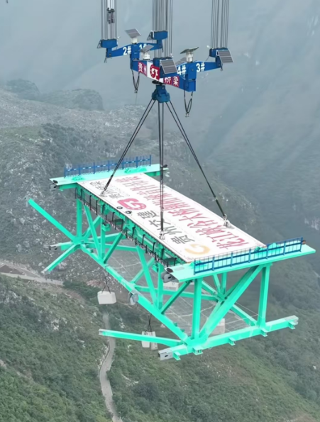 11月4日,貴州花江峽谷大橋建設現場,隨著纜索吊機將重約215噸的首件鋼桁梁精準吊裝至指定位置,大橋施工進入新階段,為明年通車運營奠定了基礎。